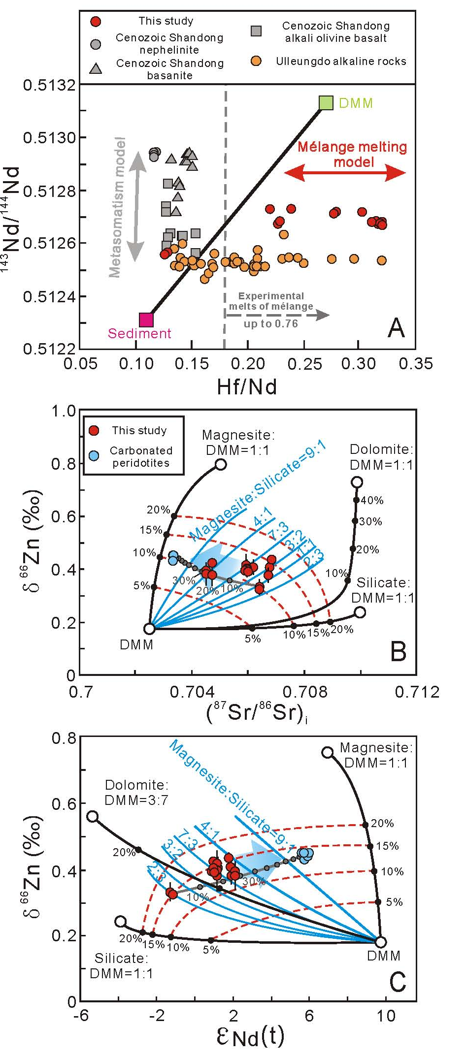 2. 限定了俯冲混杂岩底劈熔融作用的起始深度。相较于天然混杂岩实验熔体,本次研究的部分样品具有更高的轻稀土元素和高场强元素含量,与碳酸盐化硅酸盐熔体一致(图2B)。样品Sr-Nd-Zn同位素组成进一步指示了碳酸盐化橄榄岩端元的参与(图3B和3C),且碳酸盐类型以菱镁矿为主(图3B和3C)。因此,可以将相互作用深度限定在软流圈,这比之前的实验岩石学等方面工作推测的俯冲混杂岩底劈熔融的起始深度更深。
