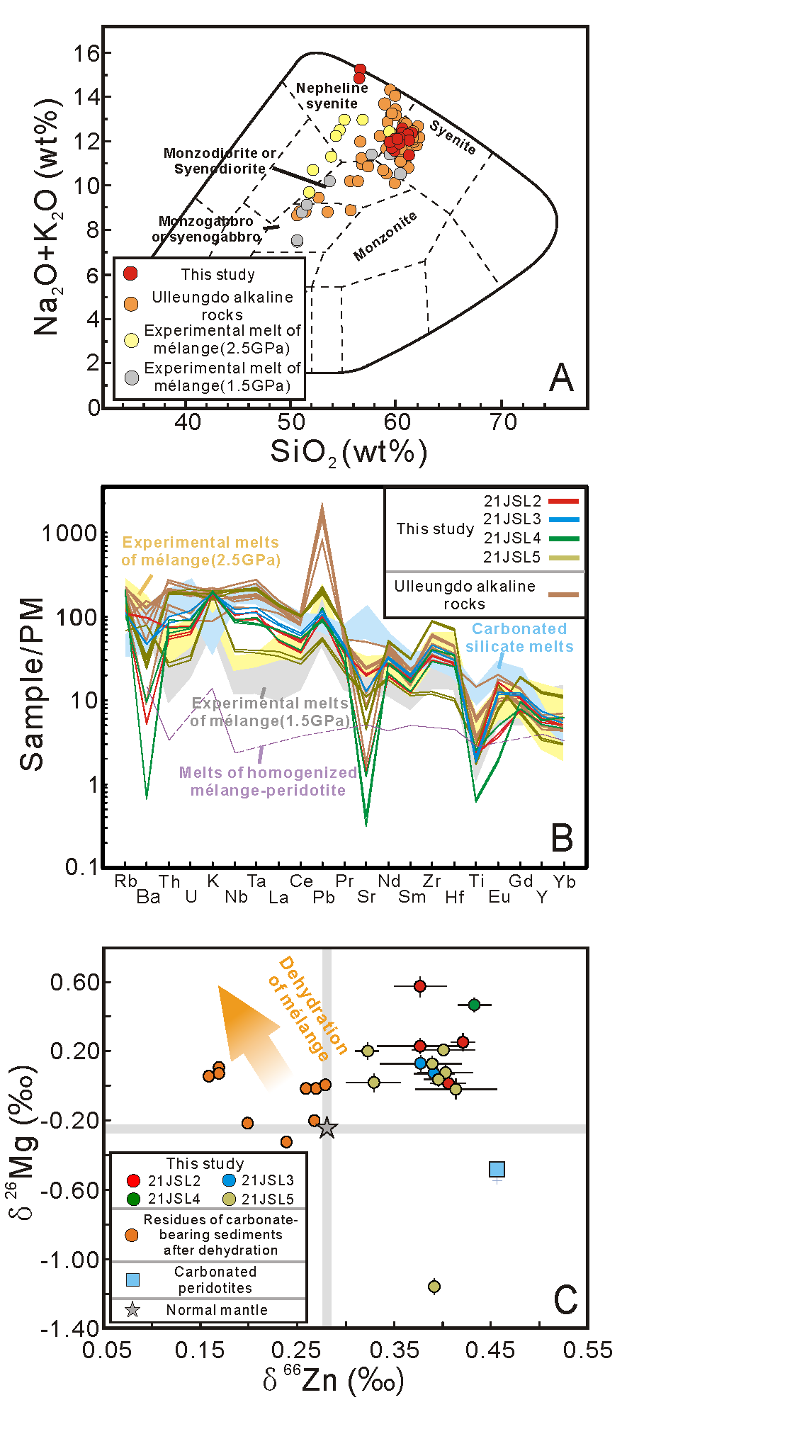 针对以上问题,优德88许文良教授引领的“地球深部动力学创新团队”成员王枫教授等通过对中国东北地区渐新世霓霞正长岩的主微量元素以及全岩Sr-Nd-Pb-Mg-Zn同位素的综合研究(图1),证实霓霞正长岩的混杂岩底劈熔融成因,并结合东北亚构造环境演化,揭示了俯冲混杂岩底劈熔融的地幔动力学条件。具体研究成果如下: