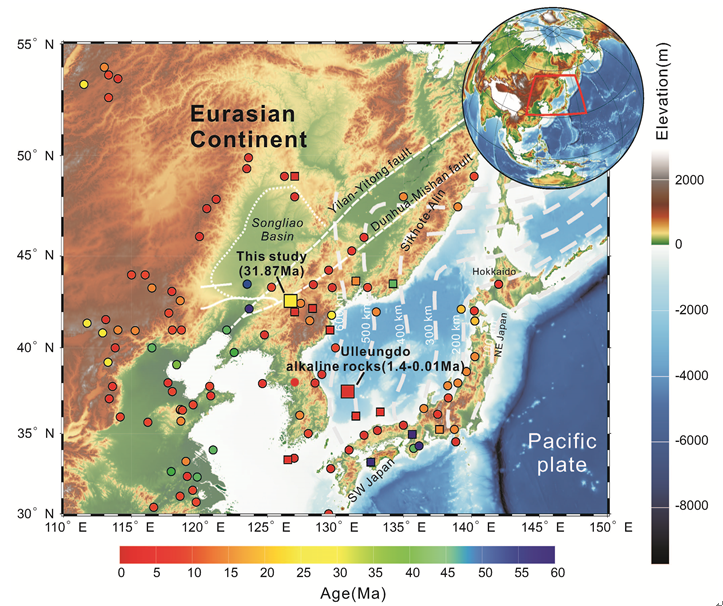图1 东北亚陆缘新生代碱性火成岩分布图。圆形代表基性碱性岩,方形代表中性碱性岩,颜色代表年龄。数据来自GEOROC数据库(http://georoc.mpch-mainz. gwdg.de/georoc/)