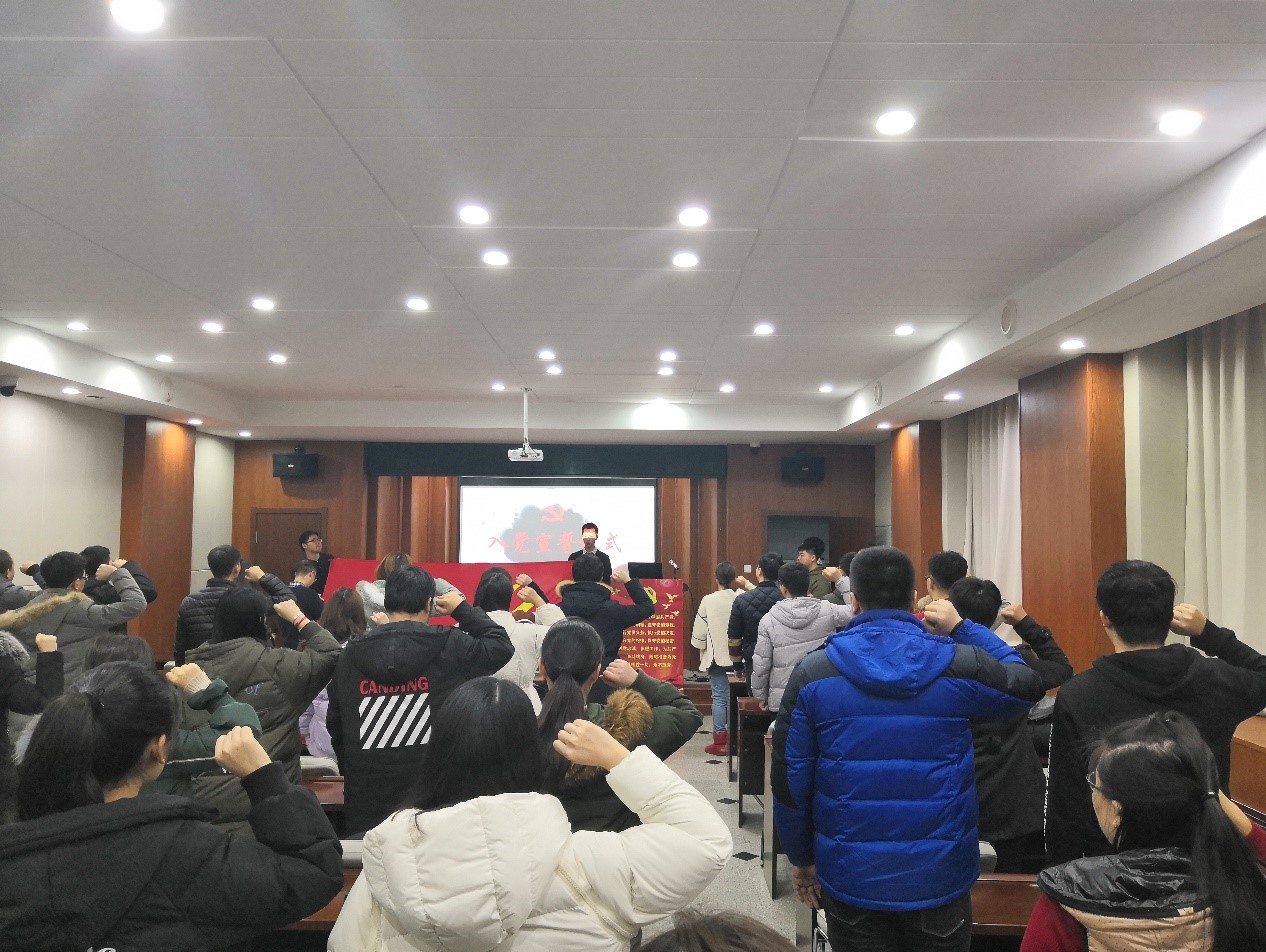 2018年12月28日上午十点,优德88在鸽子楼报告厅举行了庄严而神圣的入党宣誓仪式。公司党委书记杨洲、党委办公室主任周小萌老师、辅导员李功宇老师、各年级党支部书记以及本年度新发展的研究生与本科生预备党员参加了本次活动。