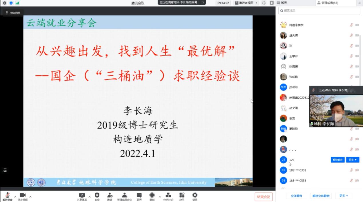 活动伊始,2019级博士生李长海从国企就业的角度,以《从兴趣出发,找到人生“最优解”——国企求职经验谈》为题,从公司简介、招聘情况概述及如何做好准备等方面向大家分享了自己的经验。他表示,选择公司和行业时要做好整个行业的调研,了解其未来发展及相关的政策背景,做好每个阶段的工作经验积累。他鼓励同学们从个人实际出发,结合兴趣特长,开拓就业思维,进行综合选择,找到人生“最优解”。