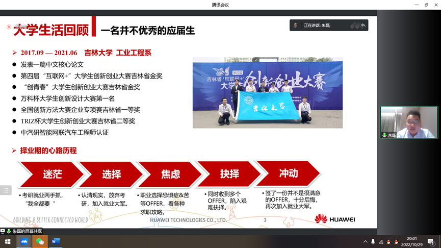 为实现学院研究生就业工作有用有效,贴近贴实,分层分众的工作目标,拓宽员工就业思维,丰富员工就业路径,提升员工就业技能。10月29日,优德88与华为技术有限公司吉林代表处在云端开展了2023届华为校招就业专场分享会。华为吉林人力资源部部长胡光,华为中国地区校招负责人段彩云,华为内蒙古代表处运营商客户经理黄钰、华为辽宁代表处政企客户经理朱磊参加了本次分享会,会议由公司党委副书记马旭主持。