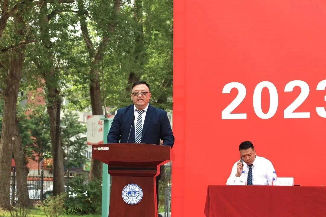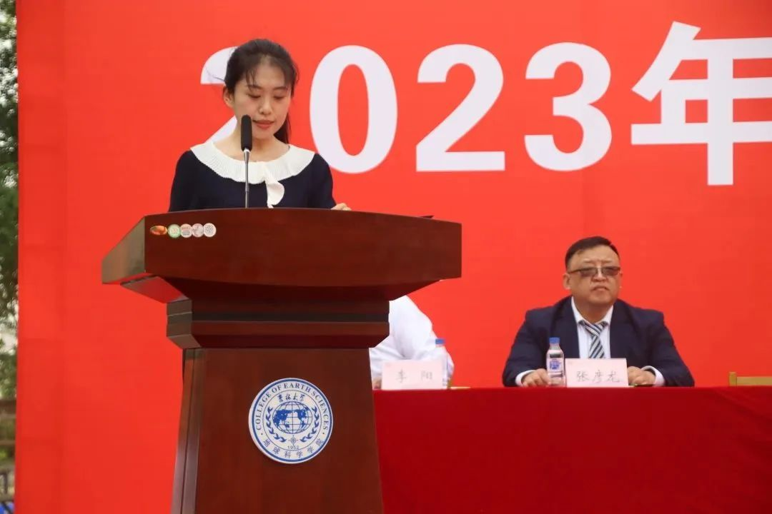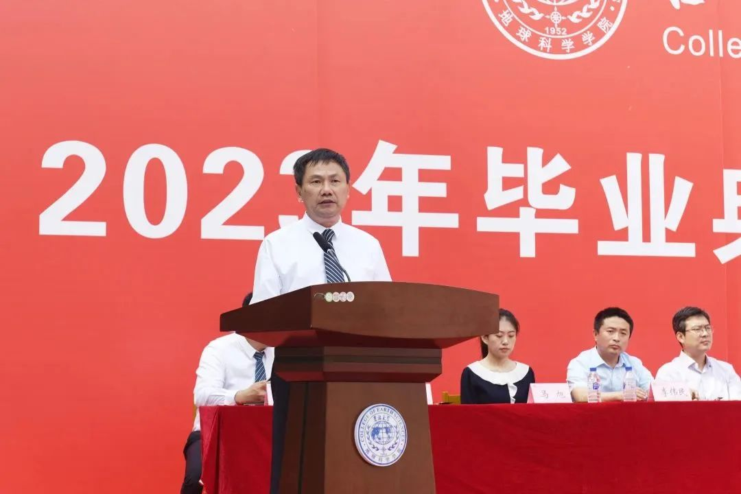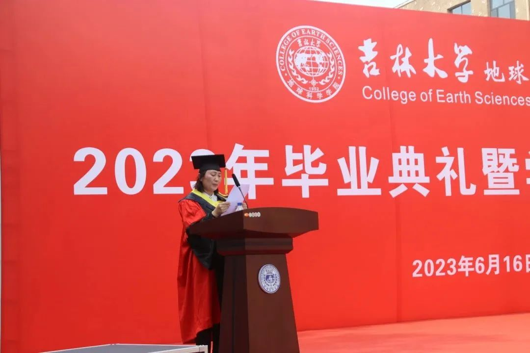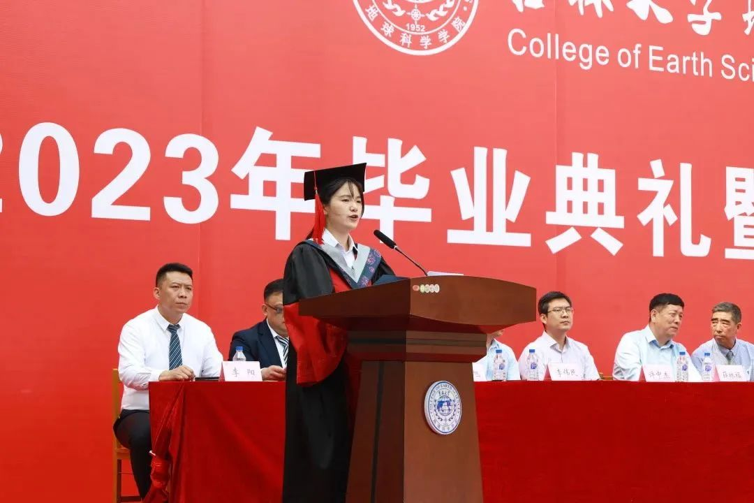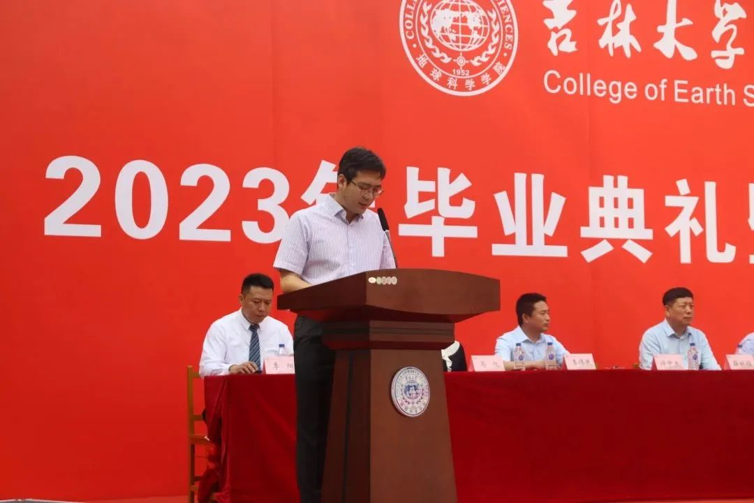 在经理致辞环节,单玄龙经理为所有毕业生致以真挚的祝福。23届的毕业生是最特别的一届毕业生,大学四年疫情就占了三年,但同学们在这场历史考验中顾大局、识大体、明大义,克服了种种困难完成了学业。惟其艰难,方显勇毅;惟其磨砺,始得玉成。同学们在人生最美好的年华,来到吉大,逐梦远航,与学院共同成长。回望来时路,你们与伟大时代“双向奔赴”,展望新征程,这方校园,再次成为你们人生的新起点,你们即将扬帆起航,开启新征程,希望你们无论何时,都要不忘地学荣光,手握科技报国的“爱国锤”;无论何时,都要不忘地质初心,手持恪守自我的“人生罗盘”;无论何时,都要不忘地学理想,手执追求卓越的“奋斗放大镜”。此去当是良辰美景;他日归来,仍当是少年。有朋自远方来,又赴远方,但无论远方有多远,鸽子楼永远是你们的摇篮!