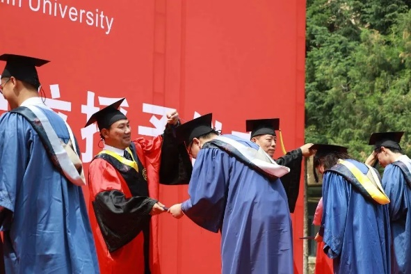 典礼开始前,毕业生们早早地穿好学士服整理好仪表,来共同见证这难忘的时刻,为青春致贺,相互整理学士服、拥抱、合影,在毕业留言板上留下自己的名字。